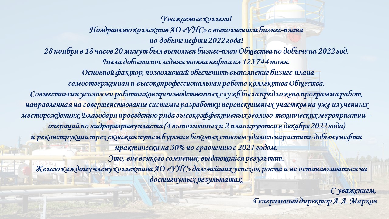 Поздравление коллектива АО "УНС" с выполнением бизнес-плана по добыче нефти 2022 года!